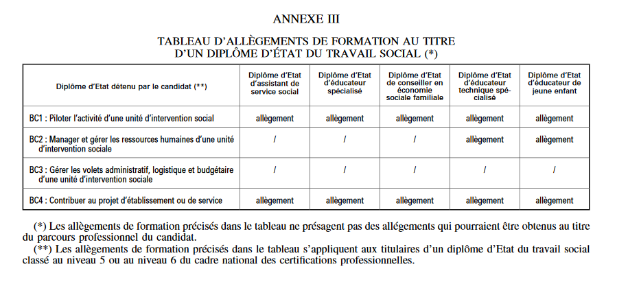 Les candidats titulaires d’un diplôme du travail social bénéficient d’allègements de formation précisés à l’annexe III (ci-dessous).