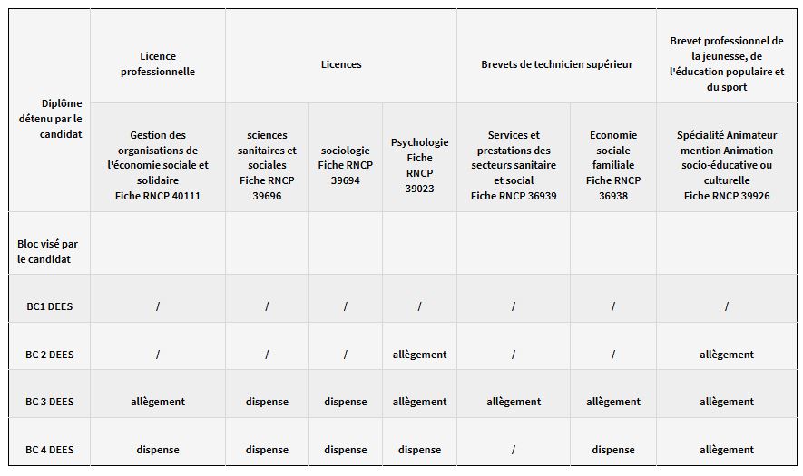 Equivalence BC3 et BC4 avec l’ensemble des diplômes en travail social de niveau 6 (DEES, DEASS, DECESF, DEETS, DEEJE). L’obtention du DEES confère le grade de licence et permet d’accéder aux formations supérieures du CASF.