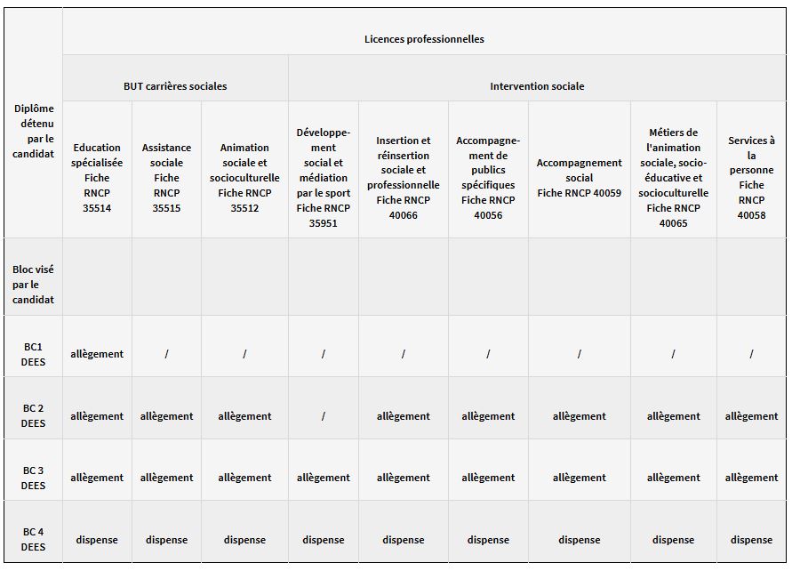 Les allègements de formation précisés dans les tableaux ne présagent pas des allégements qui pourraient être obtenus au titre du parcours professionnel du candidat