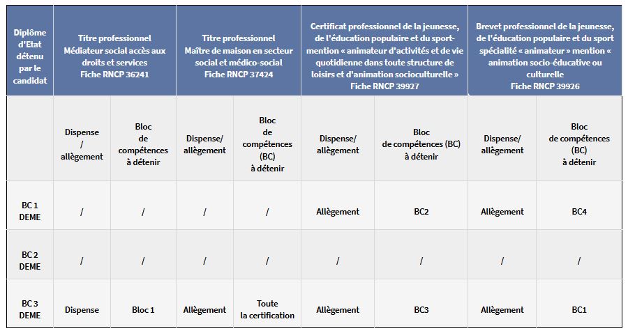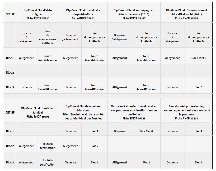 (*) Les allègements de formation précisés dans le tableau ne présagent pas des allégements qui pourraient être obtenus au titre du parcours professionnel du candidat.